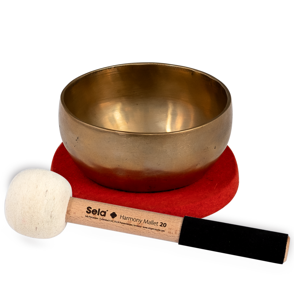 Jede Sela Harmony Singing Bowl wird mit einem nützlichen Zubehörset ausgeliefert. Der beiliegende Schlägel ist dabei besonders hervorzuheben, denn er stellt eine Kombination aus einem klassischem Filzklöppel und einem Reibholz dar. Die Klangschale kann demnach mit dem runden Filzkopf angespielt oder mit dem lederbezogenen Stiel sanft gerieben und zum Singen gebracht werden, wodurch sich der Klang des Instruments auf unterschiedliche Weise entfaltet. Eine Baumwolltasche mit Kordelzug und rotem Velourfutter schützt die Klangschale beim Transport, ein Filzring sorgt für einen sicheren Stand und optimales Schwingungsverhalten beim Anspielen der Sela Harmony Singing Bowl.