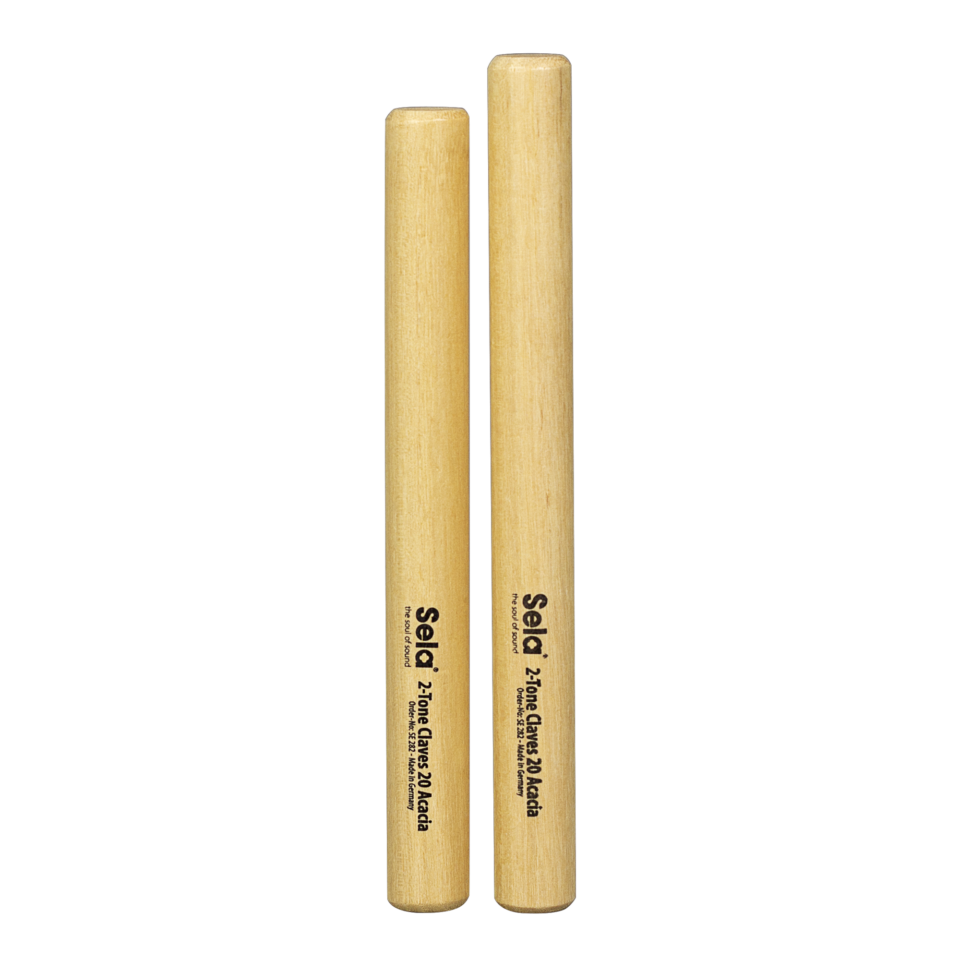 Die Stäbe der SELA 2-Tone Claves haben verschiedene Längen (200 und 190 Millimeter) und unterscheiden sich damit von herkömmlichen, zumeist gleichlangen Klangholzpaaren. Je nachdem, welchen Stab der 2-Tone Claves man in der Hand hält und mit welchem man anschlägt, lassen sich hier zwei unterschiedliche Grundtöne erzeugen und die gespielten Rhythmen in der Tonhöhe variieren. Die SELA 2-Tone Claves werden in Deutschland aus hochwertigem Akazienholz hergestellt, welches warm und hell klingt und einen kräftigen, klar definierten Anschlagston liefert.