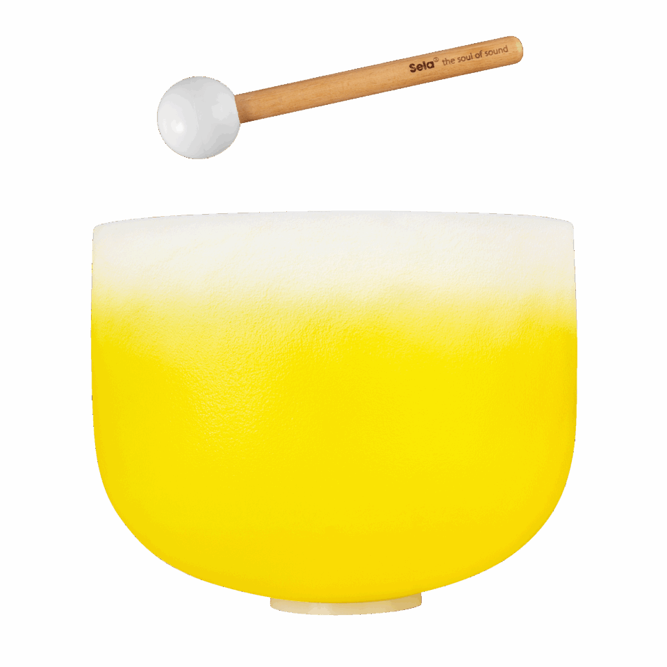 Das gelbe 12“-Modell ist auf das Solar-Plexus-Chakra ausgerichtet und auf die Note E gestimmt. Bei der 432-Hz-Variante liegt der Kammerton A aber nicht auf der westlichen Standardfrequenz von 440 Hz, sondern bei 432 Hz. Dieser Stimmung wird unter anderem eine besonders entspannende und beruhigende Wirkung nachgesagt. Allerdings harmoniert diese Klangschale dadurch nicht mit herkömmlich gestimmten Instrumenten. Sie sollte entweder einzeln oder zusammen mit anderen 432-Hz-Instrumenten – wie etwa unseren Sela Unity Handpans – gespielt werden.