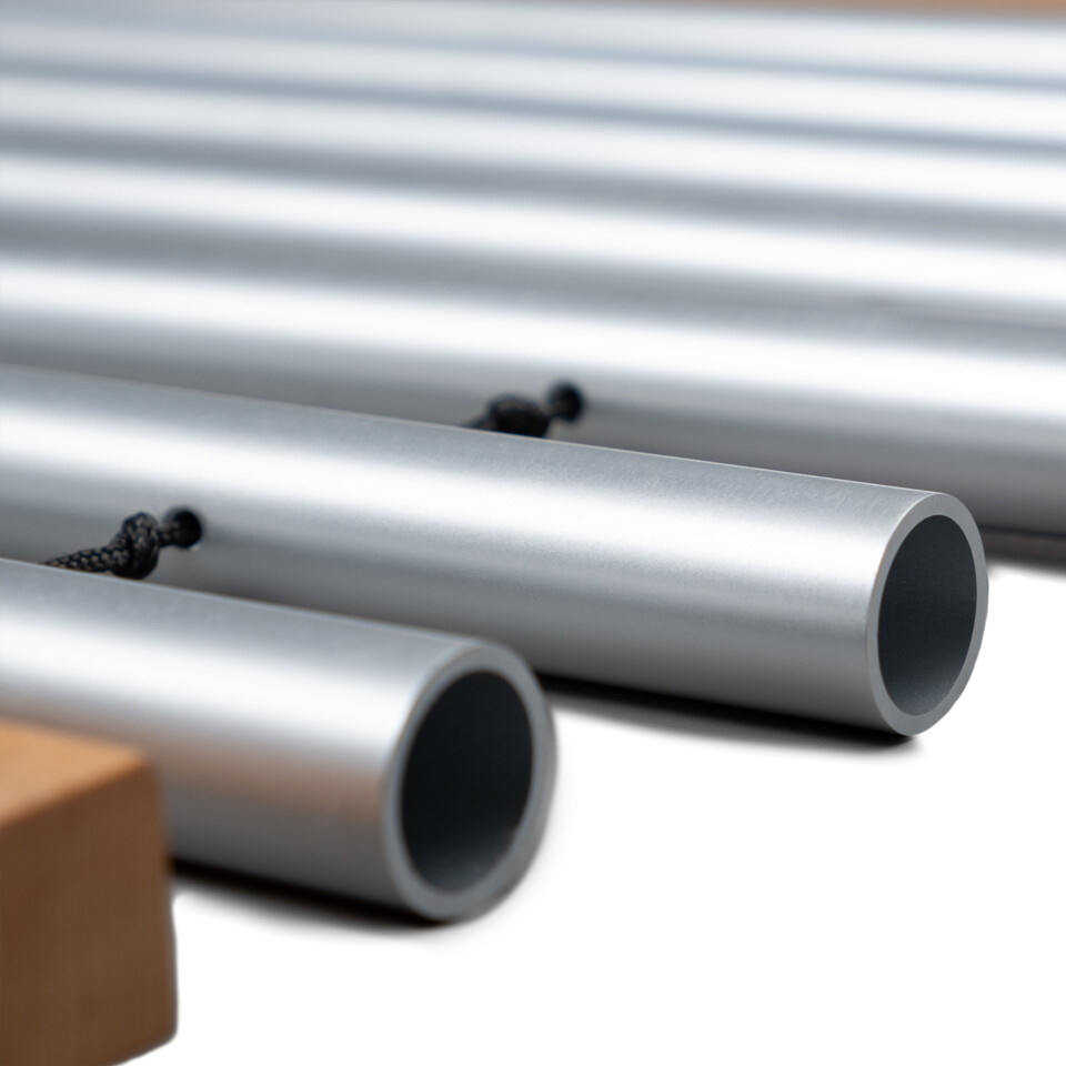 Sela Harmony Chimes gibt es wahlweise mit sieben oder neun Tönen sowie mit Hölzern aus Walnuss oder Buche. Bei den Modellen aus Walnuss sind die Klangröhren für einen besonders geheimnisvollen, edlen Look schwarz eloxiert, bei der etwas klassischer und dezenter wirkenden Buchenholzvariante sind die Stäbe silberfarben. Zum Lieferumfang der Sela Harmony Chimes gehören eine gepolsterte Tragetasche, ein weicher Samt-Einleger zum Einwickeln der Chimes sowie der Schlägel, der über einen Stiel aus Buchenholz und einen weichen Kopf aus Wolle verfügt.