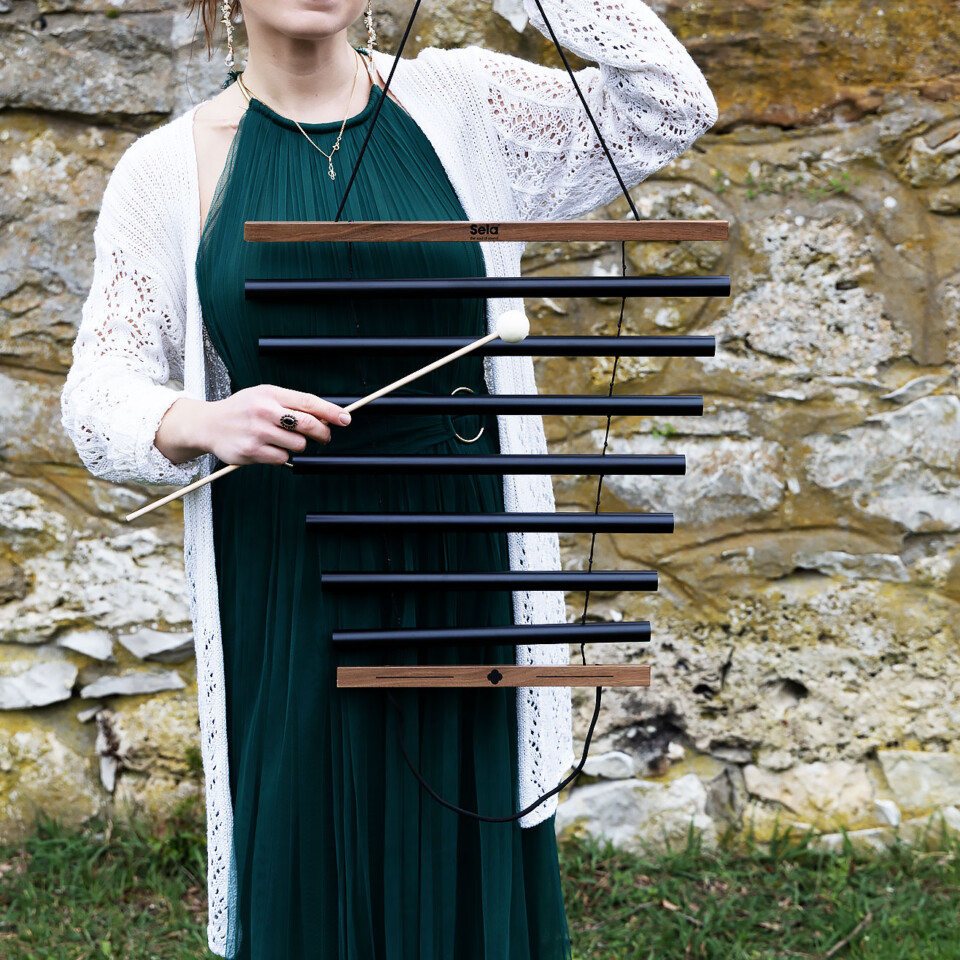 Sela Harmony Chimes erzeugen stimmungsvolle, beruhigende Klänge. Das handgehaltene Instrument besteht aus mehreren Aluminium-Klangröhren, die an reißfesten Nylonschnüren befestigt und von zwei Haltestäben aus Holz eingefasst sind. Gespielt werden die Sela Harmony Chimes mit dem beiliegenden Schlägel. Einmal in Schwingung versetzt, können sie auch sanft geschwungen, gedreht oder vorsichtig herumgewirbelt werden, um den ganzen Raum mit ihrem sanften Klang zu erfüllen.
