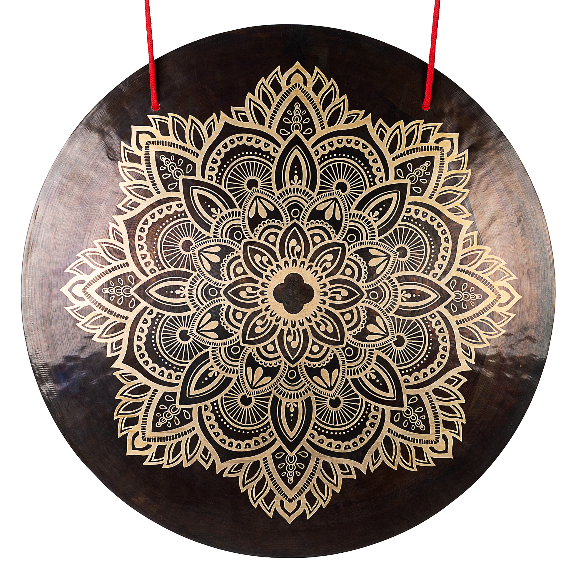 Das Flower-Mandala-Design zeichnet sich durch dunklere, mattierte Oberflächenbereiche aus, die mit fein gravierten Mustern kontrastieren. Die detaillierte Mandalastruktur erzeugt dezente reflektierende Akzente und eine dichte visuelle Textur, während das zentrale Sela-Symbol den visuellen Mittelpunkt bildet. Kleine Variationen in der Gravur bleiben bewusst erhalten und verleihen jedem Gong eine individuelle Erscheinung.