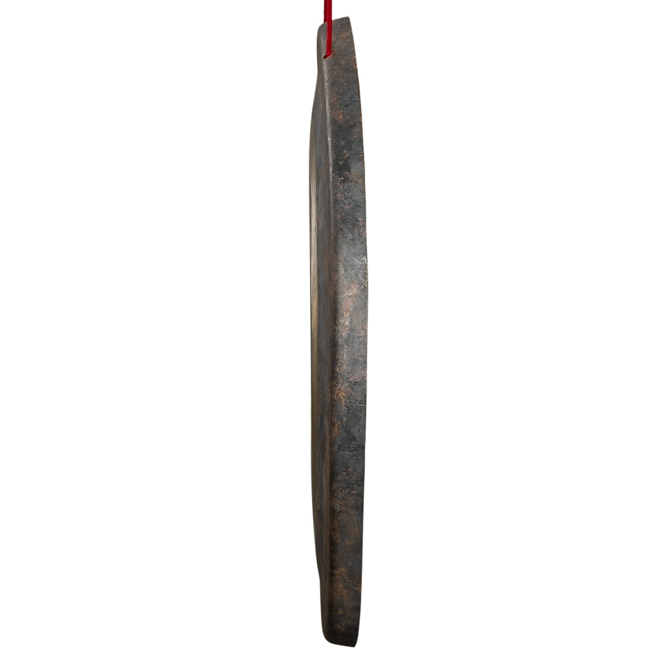 Der Sela Chau Gong Standard hat eine traditionelle Form mit nach hinten gebogener Felge. Er ist am äußeren Rand und in der Mitte unbehandelt und auf der Fläche dazwischen abgedreht – dadurch entsteht die charakteristische Optik mit der schimmernden, matt-goldenen Oberfläche.