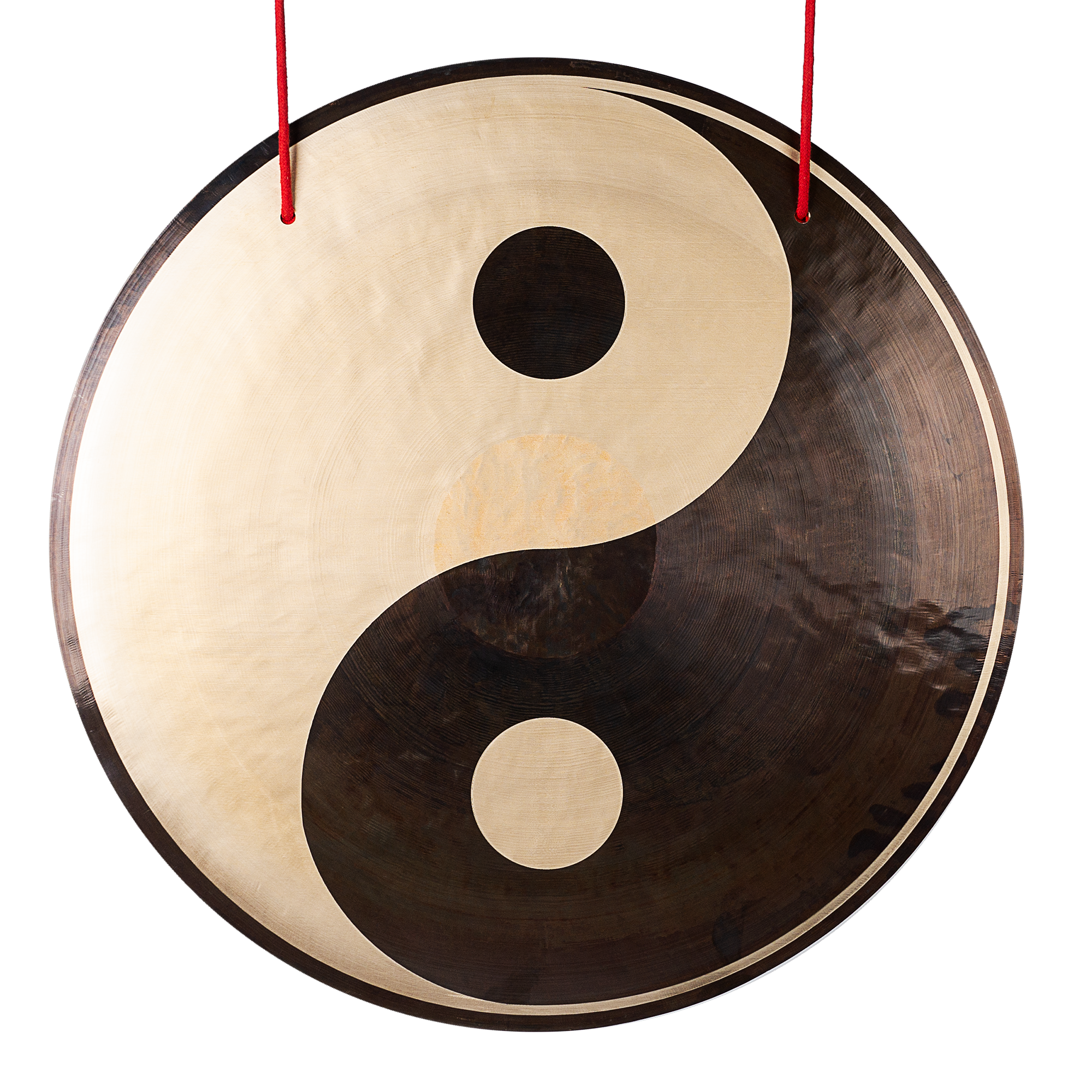 Das Yin–Yang-Design zeichnet sich durch eine polierte Metalloberfläche mit kontrastierenden hellen und dunklen Bereichen aus, die das Symbol definieren. Feine, kreisförmige Oberflächenstrukturen strahlen vom Zentrum nach außen und erzeugen visuelle Tiefe sowie dezente Variationen. Diese Unterschiede beeinflussen das Ansprechverhalten und die Obertonverteilung, während das zentrale Yin–Yang-Motiv den visuellen Mittelpunkt bildet und das Zusammenspiel von klanglicher Stabilität und harmonischer Bewegung betont.