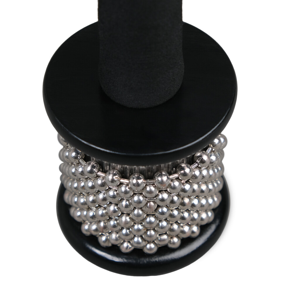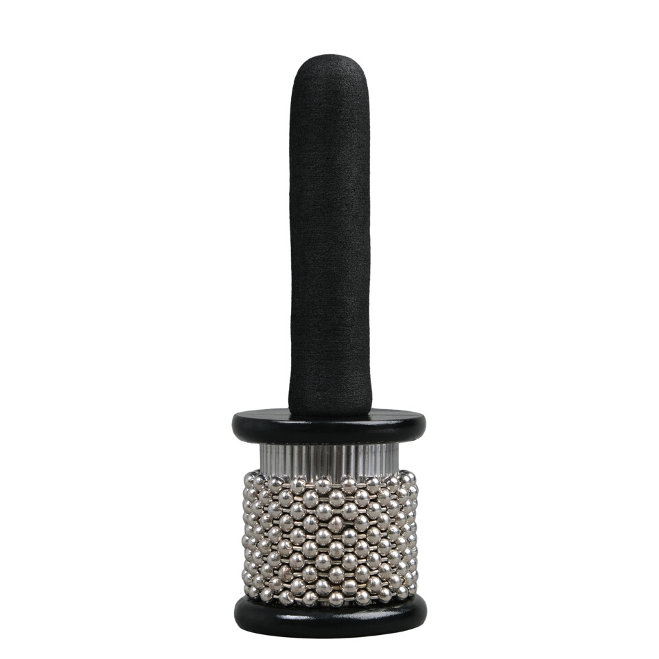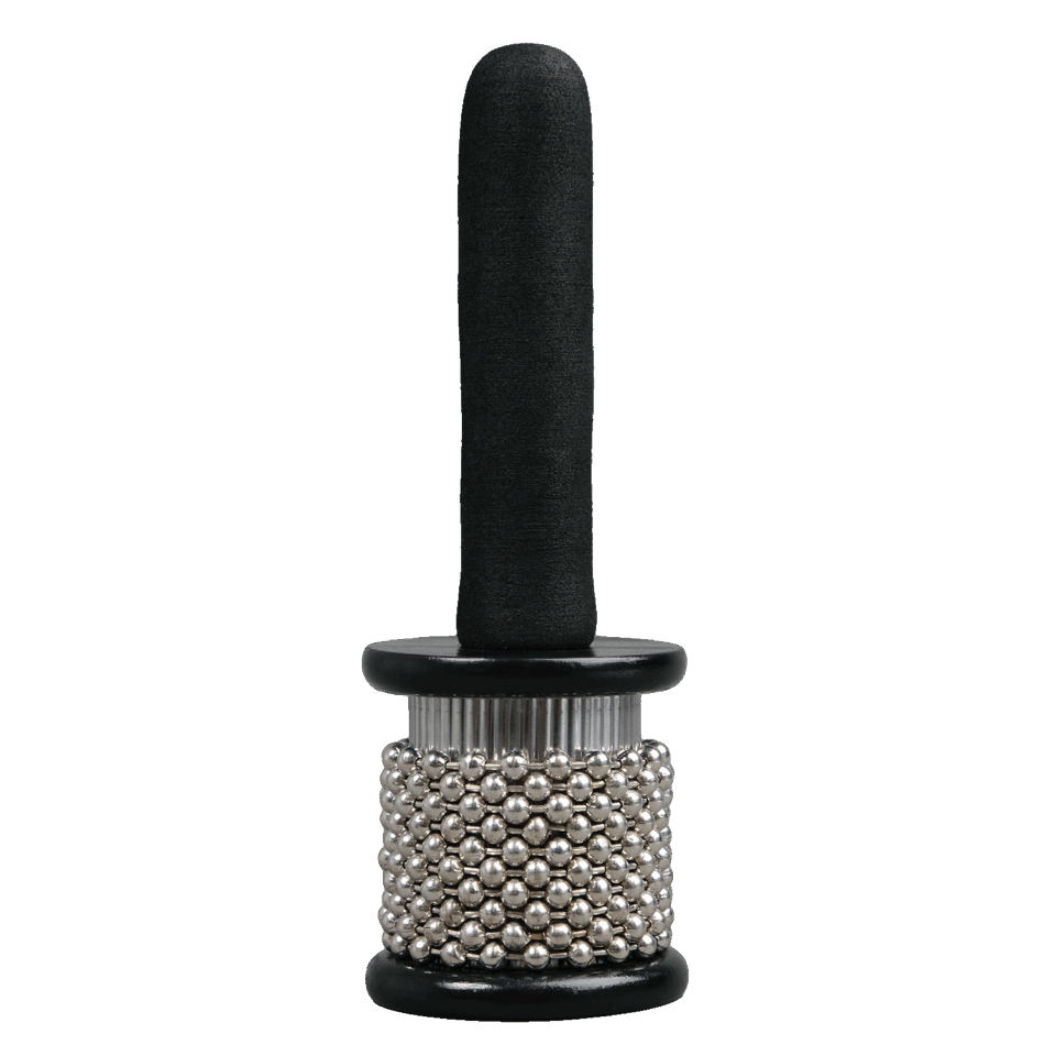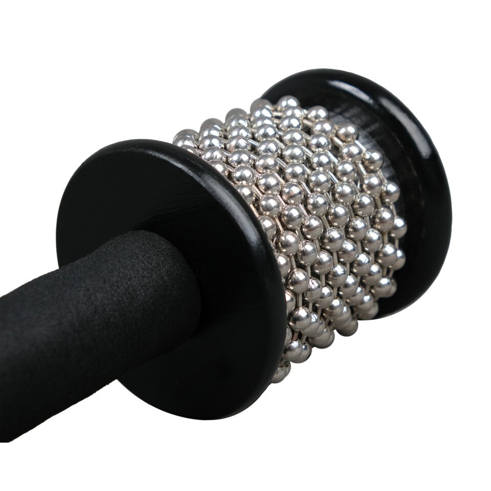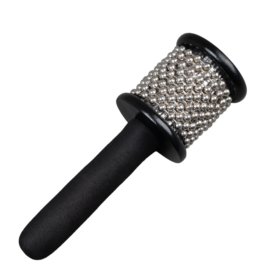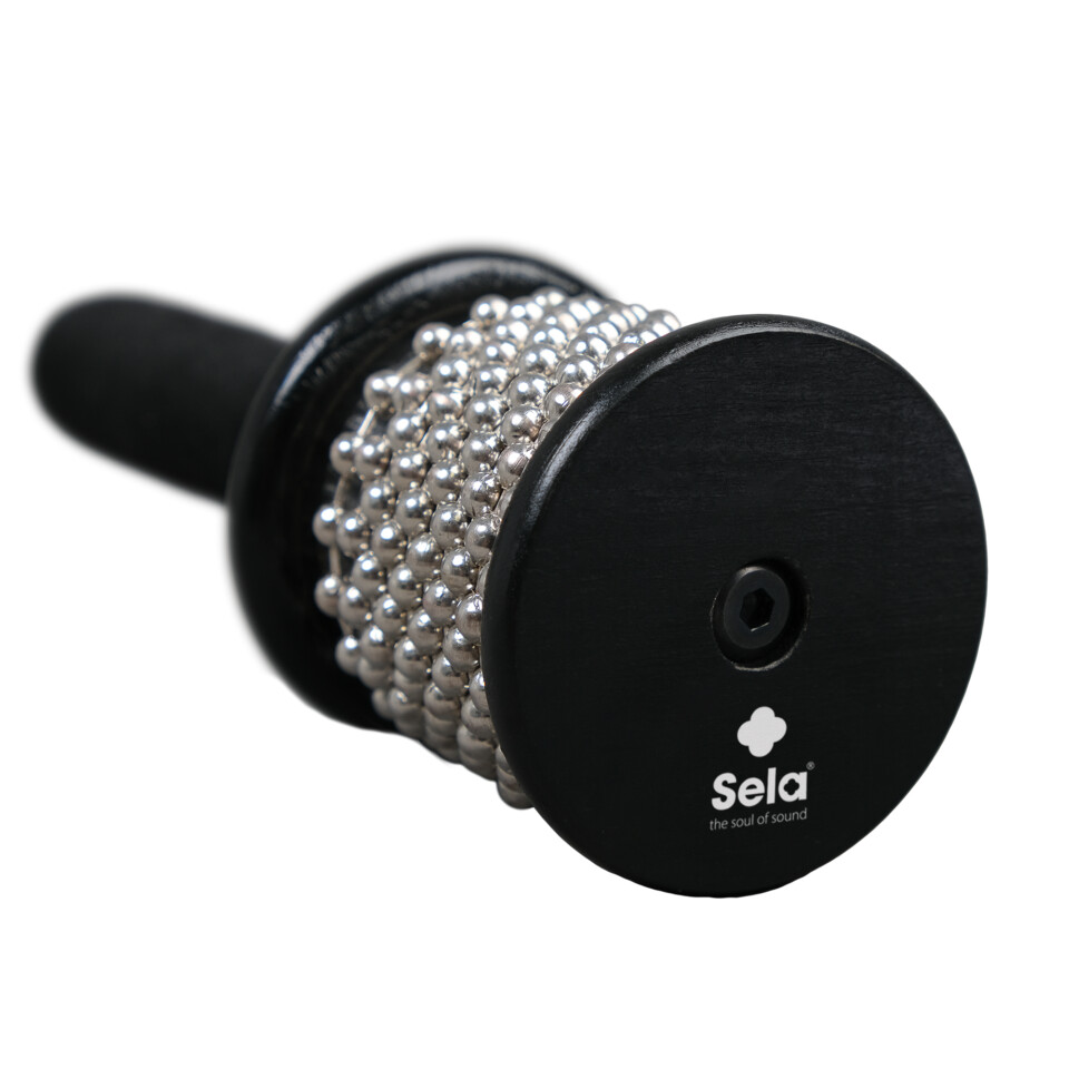 Die Cabasa ist ein faszinierendes Perkussionsinstrument, das seinen Ursprung in Lateinamerika hat. In ihrer Urform bestand die Gefäßrassel aus dem Fruchtkörper eines Flaschenkürbisses, der mit einem Netz aus Kernen oder Perlen überzogen wurde. Die Sela Cabasa setzt hingegen auf die moderne Bauform mit einem mit einem zylindrischen Kopfteil und einem umliegenden Profilblech. Dieses Blech ist wiederum mit zehn enganliegenden Metallperlenketten besetzt, die bei Bewegung über die Rillen im Blech gleiten und feinperlige, rauschende Klänge erzeugen.