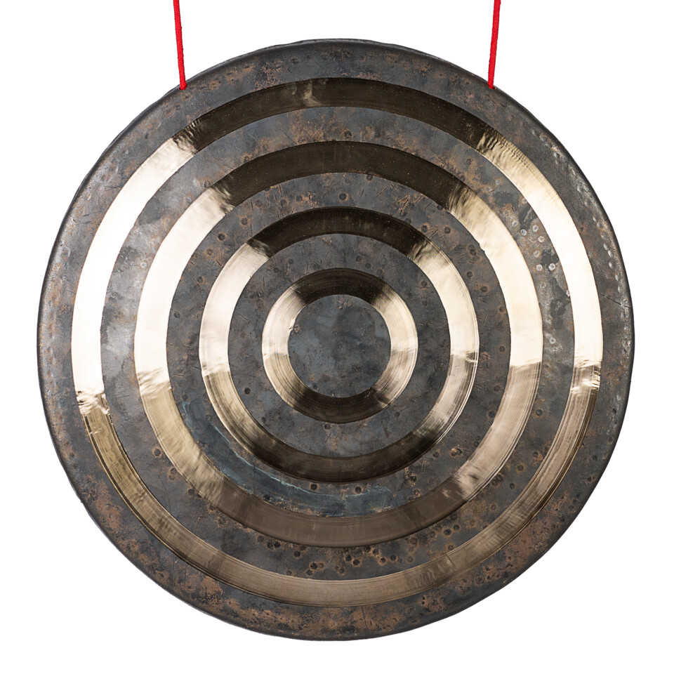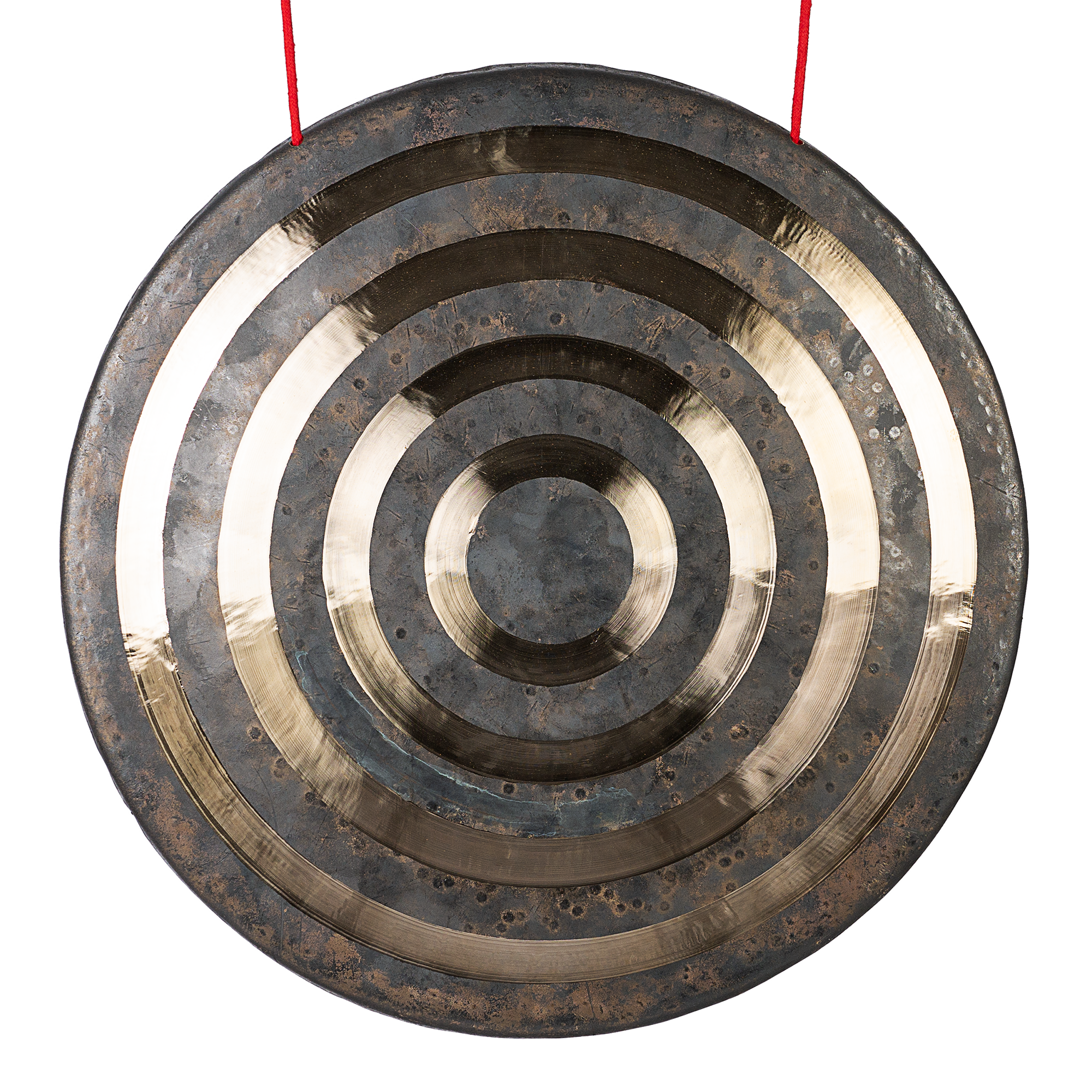 The polished concentric rings subtly influence the response and overtone development, adding clarity and projection while preserving the earthy, complex sound character of the untreated surface. Visible hammer marks and natural patina remain intact, making each gong visually and acoustically unique.