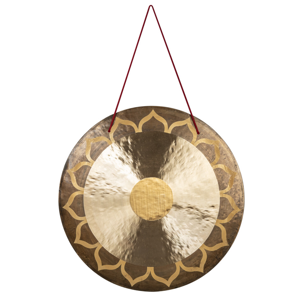 The Sela Wind Gong Lotus has an almost flat shape with the outer rim not curved backwards. Its surface is treated and twisted to different degrees on the outer edge, in the middle and in the area in between, which in itself provides a very special, characteristic look with a partially shimmering, matt-gold finish. However, the Sela Wind Gong Lotus stands out particularly because of its elegant lotus motif, which is worked into the outer area. The lotus flower is also known as the „flower of life“ and has many spiritual meanings – among other things, it stands for purity of heart, creativity, wisdom and enlightenment.