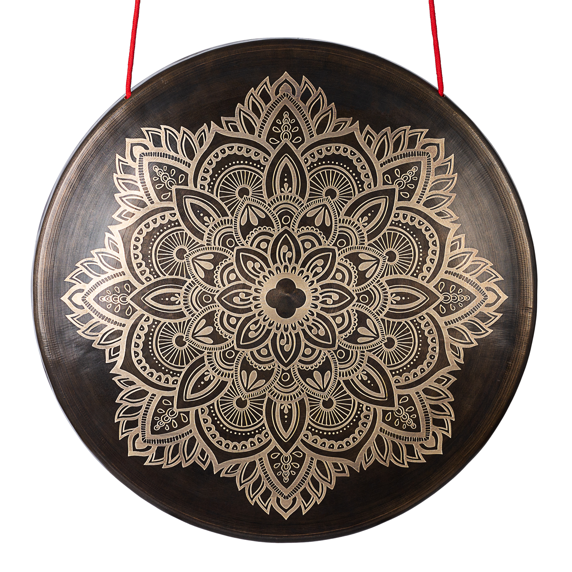 The Flower Mandala design features darker, low-gloss surface areas contrasted with finely engraved patterns. The detailed mandala structure creates subtle reflective highlights and a dense visual texture, while the central Sela symbol forms the visual focal point. Minor engraving variations are intentionally preserved, giving each gong an individual appearance.