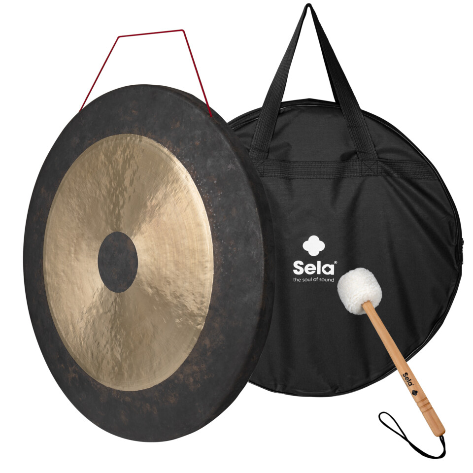 The Sela Chau gongs are real masterpieces, handmade in China from a special bronze alloy. They are available in sizes of 20, 24, 28, 32, 36, 40, 44 and 48 inches. The larger the model, the deeper and also more voluminous the sound when struck. Included with each model is a maple mallet with a plastic head with velvet cover and a zippered carrying case.