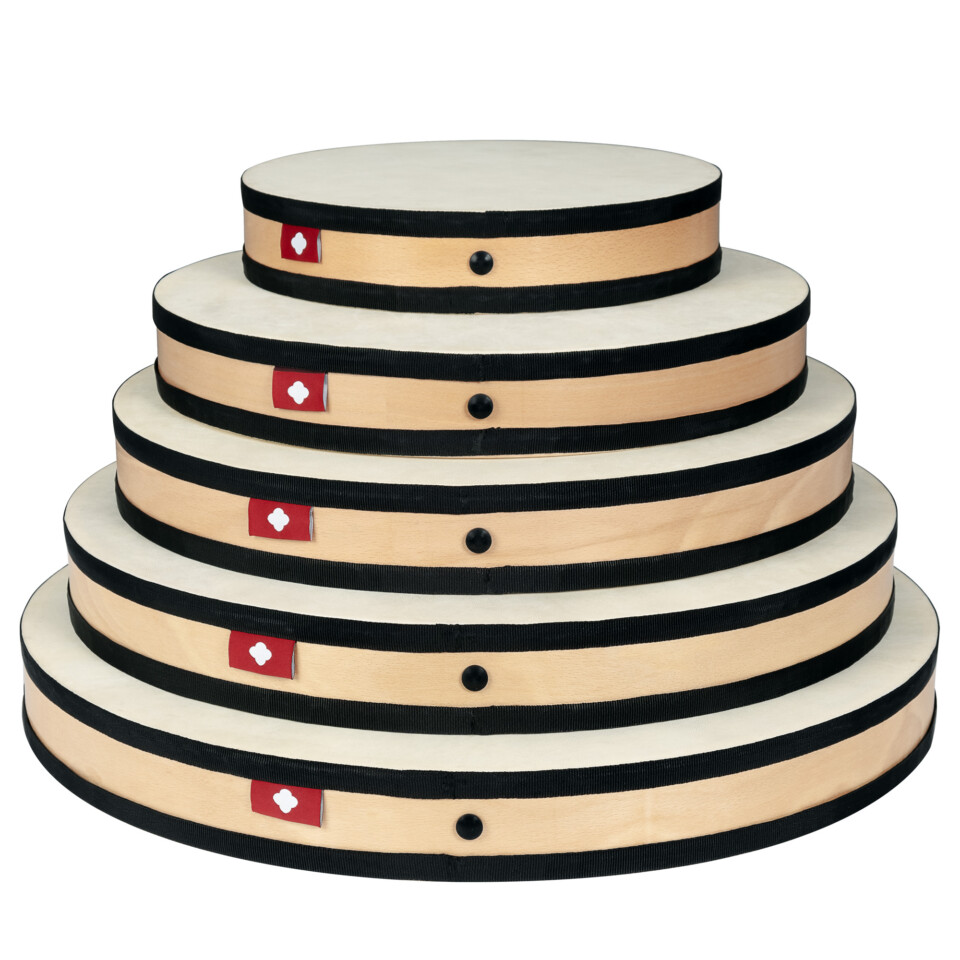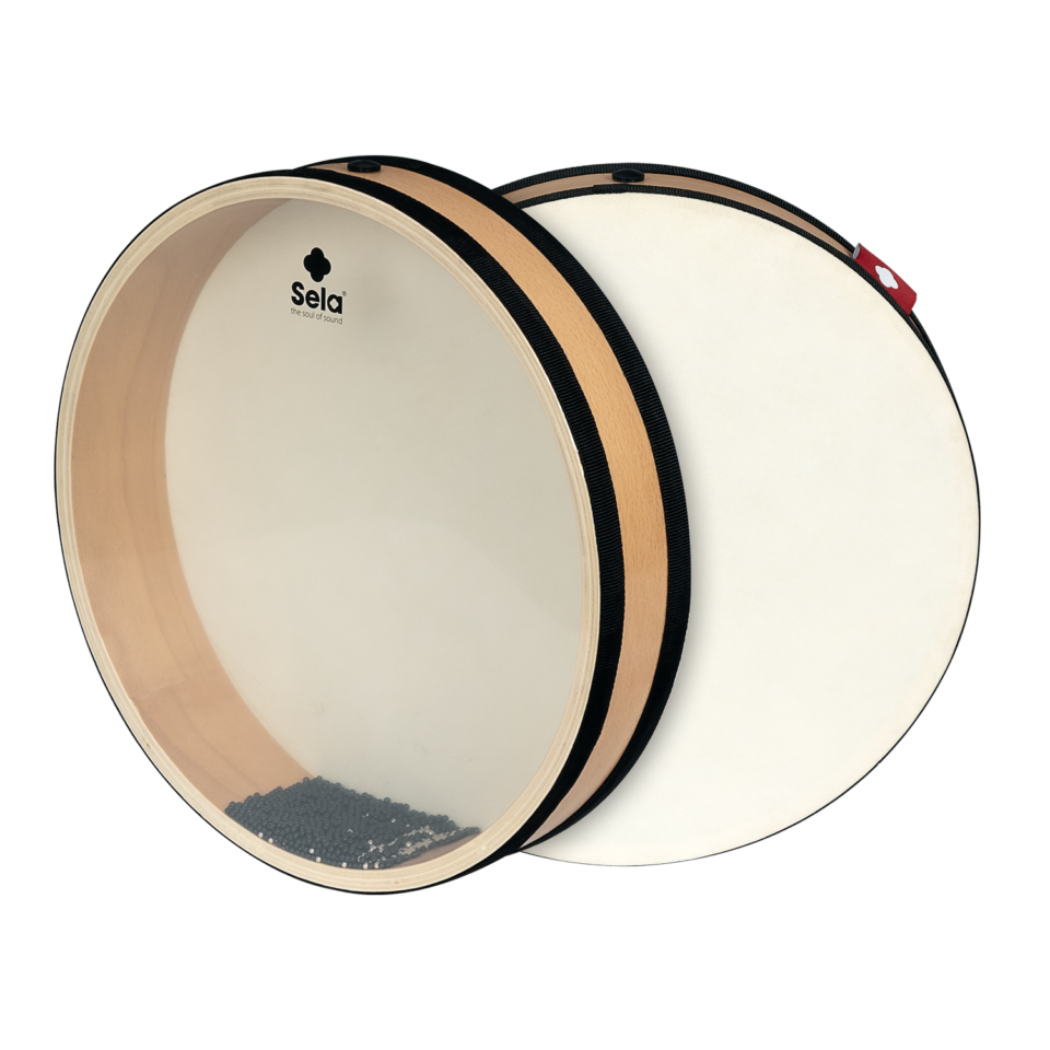 Sela Ocean Drums are available in five different sizes and feature an innovative design. They consist of a round beech wood frame, which, unlike many other hand and frame drums, is covered on both sides. Inside the Ocean Drum are many small spheres made of metal and plastic that dance across the skin when the drum is moved, creating noise effects reminiscent of ocean waves. Since one side is covered with a natural skin and the other with a plastic skin, two completely different timbres can be elicited from the Sela Ocean Drum. Thanks to a closable opening in the frame, the amount of beads and thus the volume and response of the drum can be individually adjusted.