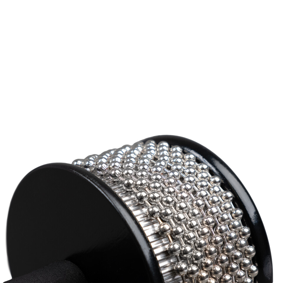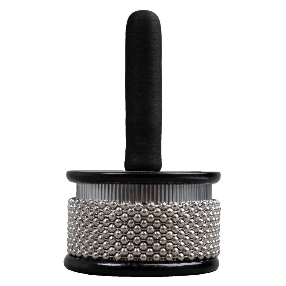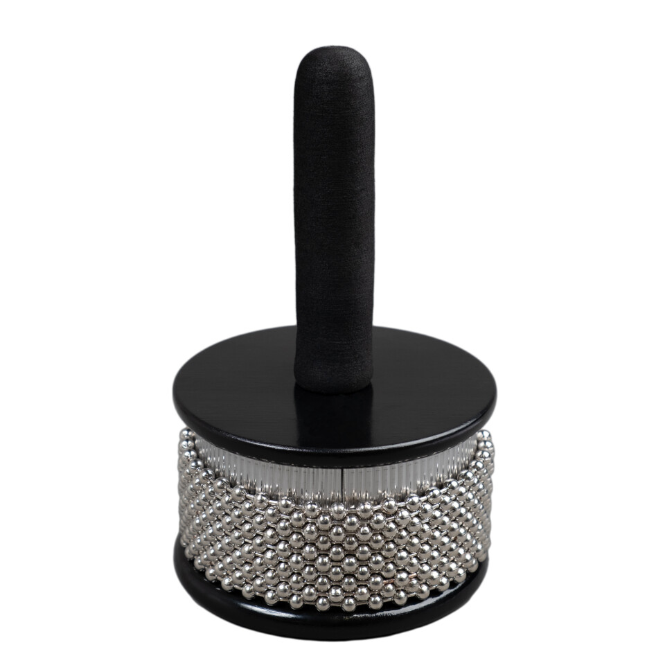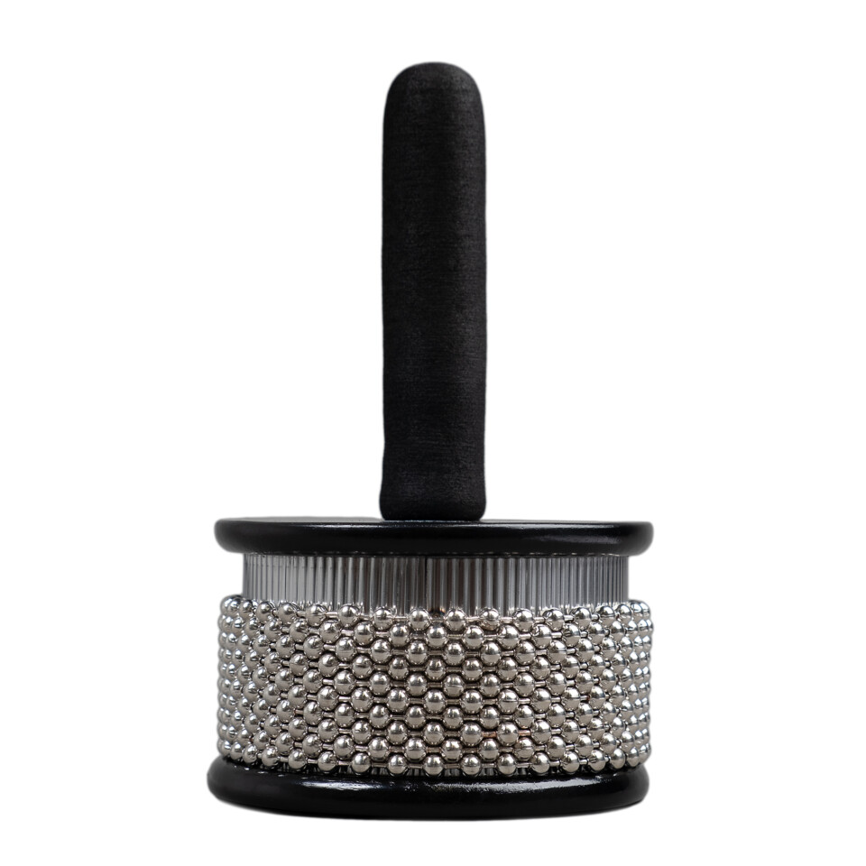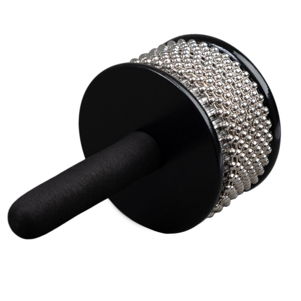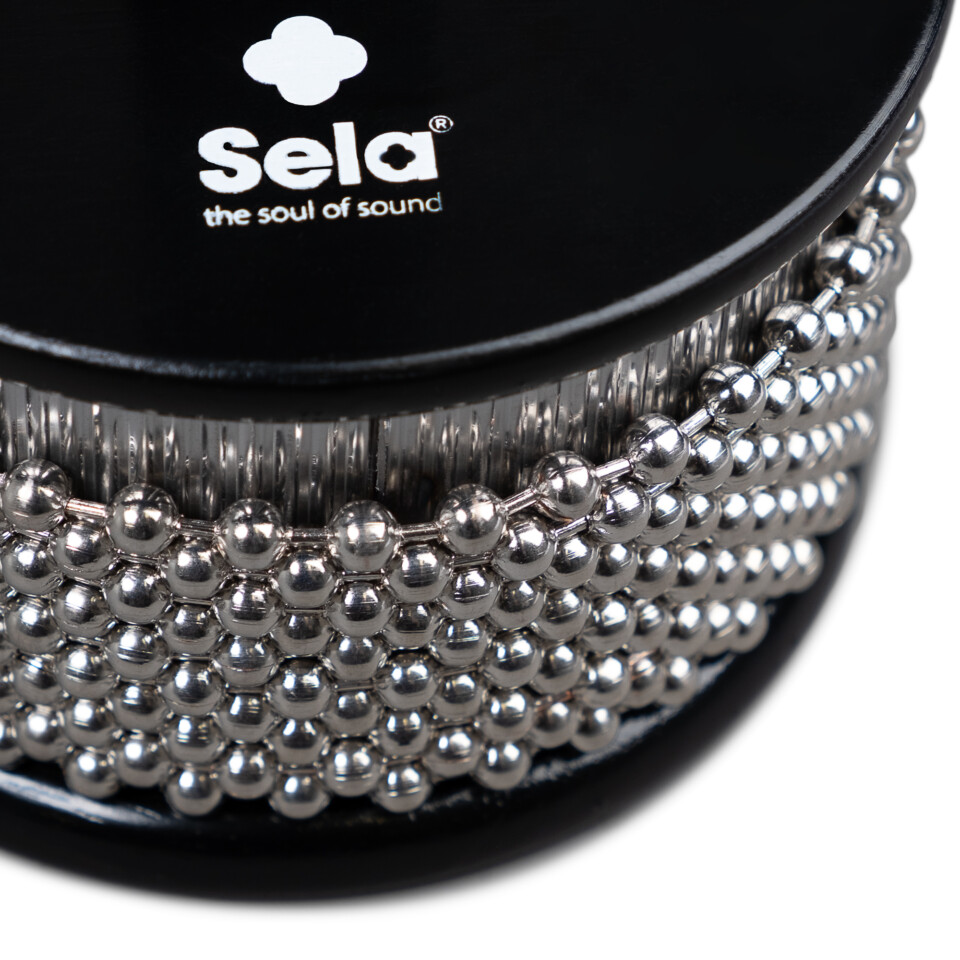 The cabasa is a fascinating percussion instrument that originated in Latin America. In its original form, the rattle consisted of the body of a gourd covered with a net of seeds or beads. The Sela Cabasa, on the other hand, is based on the modern design with a cylindrical head section and a surrounding profiled sheet. This sheet metal is again covered with ten close-fitting metal bead chains, which glide over the grooves in the sheet metal when moved and produce fine, rushing sounds.